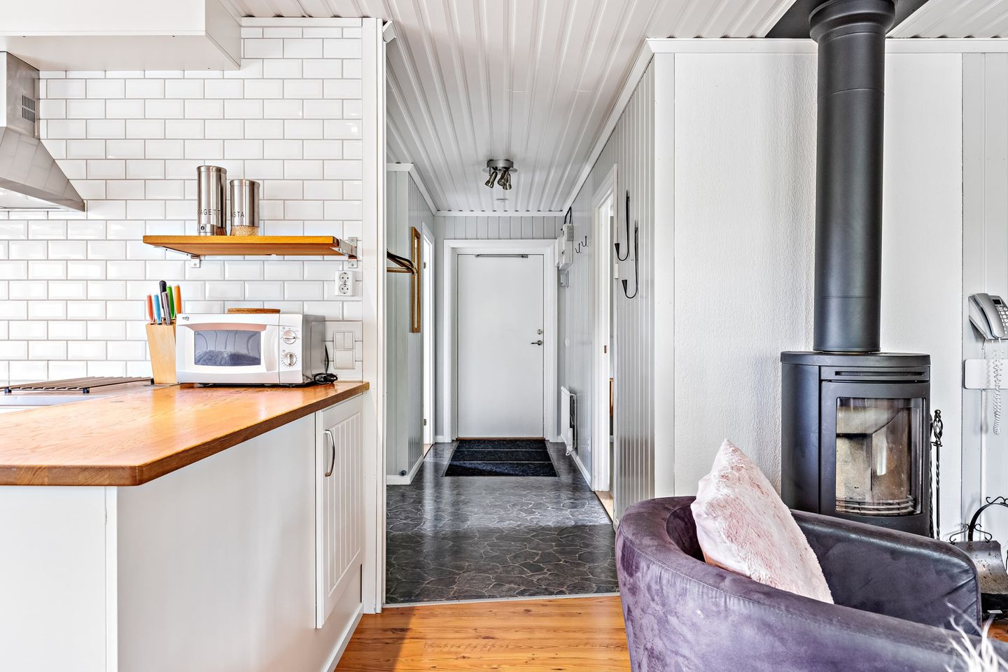 Het huisje beschikt over een volledig ingerichte keuken, met vaatwasser, koelkast, vriezer, koffiemachine (filter), waterkoker, magnetron, kookplaat en oven. Alle keukengerei is aanwezig. De keuken kijkt uit over het meer, vanuit de woonkamer ziet u het bos en het meer. Verder beschikt het huisje over twee slaapkamers:
